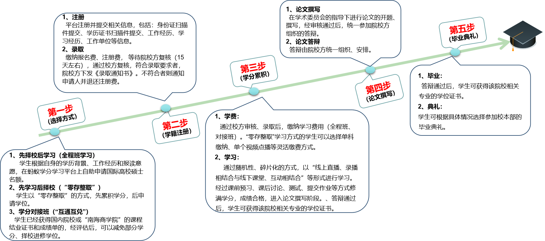 學生根據(jù)自身的學歷背景、工作經(jīng)歷和報讀意愿,在“南海學分”上自助申請國際高校碩士名額或博士名額。通過校方審核、錄取后,在平臺上以"線上直播錄播相結合與線下教學互動相結合'等形式進行學習。經(jīng)過課前預習、課后討論、測試、提交作業(yè),修滿學分、成績合格、論文撰寫、答辯通過后,學生可獲得該院校相關專業(yè)的學位證書,學位合金量與在校生完全等同。